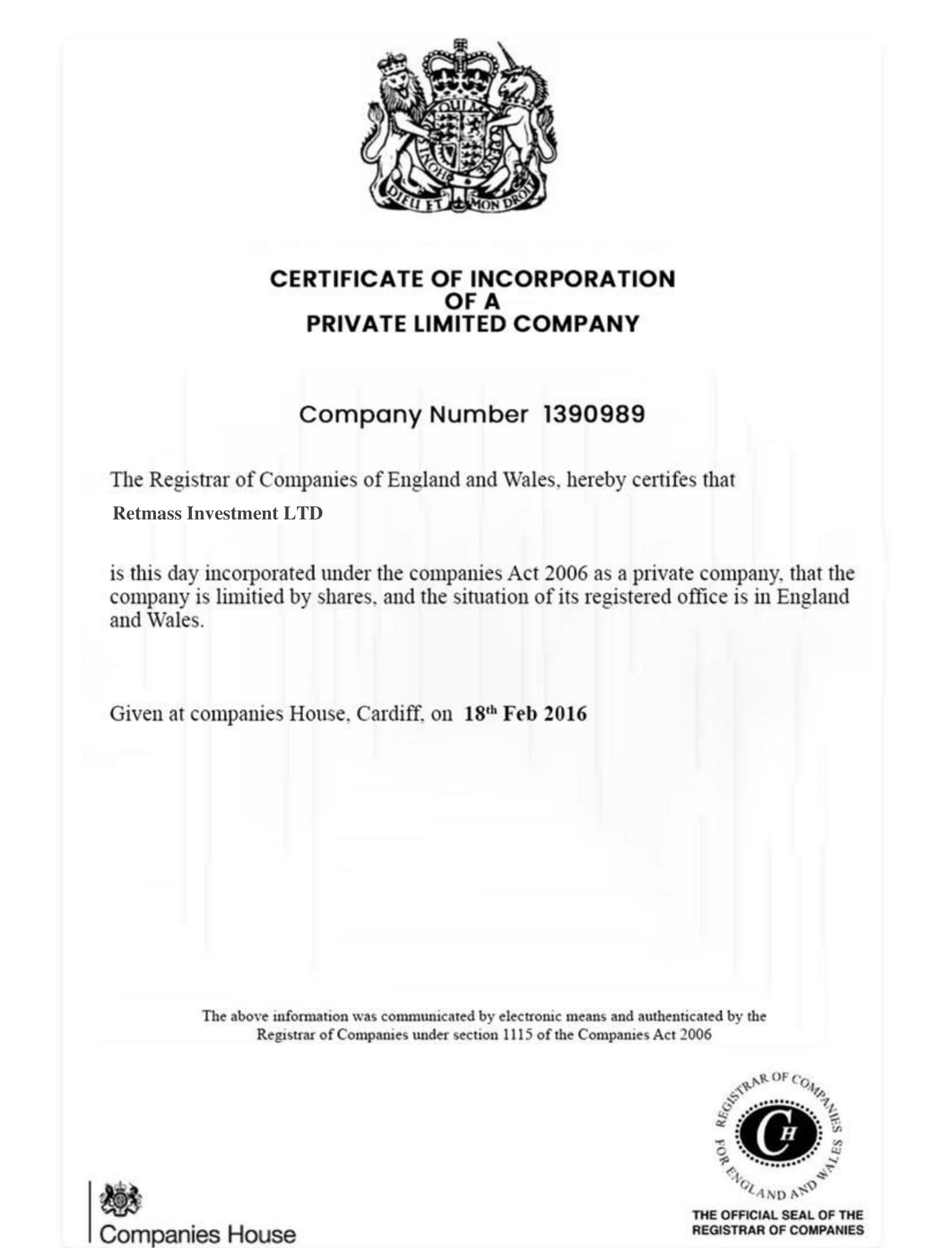 Please note that the only source of legitimate and up-to-date incorporation information about Retmass Investment LTD can be found on our website . This applies to registration number , legal information contained on the UK Registrar's website in relation to Retmass Investment LTD, as well as any additional information and any related data.